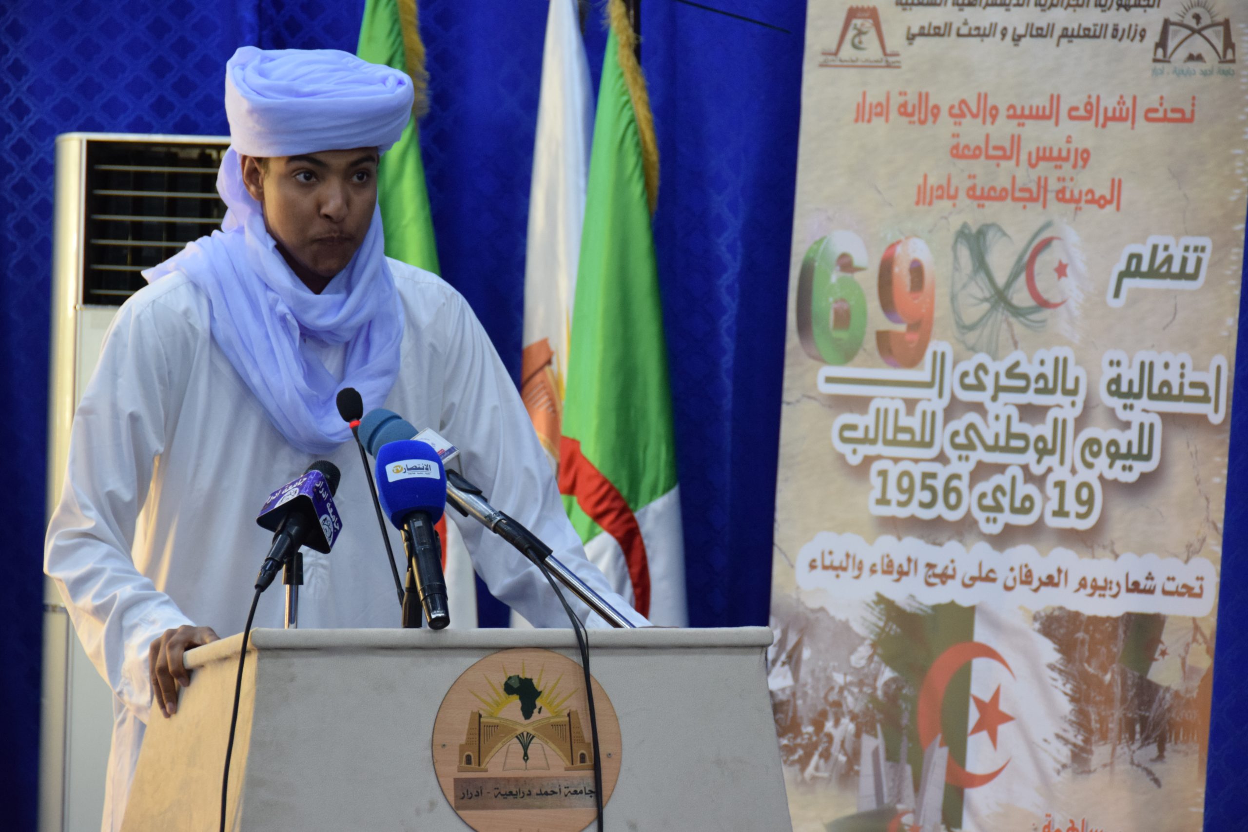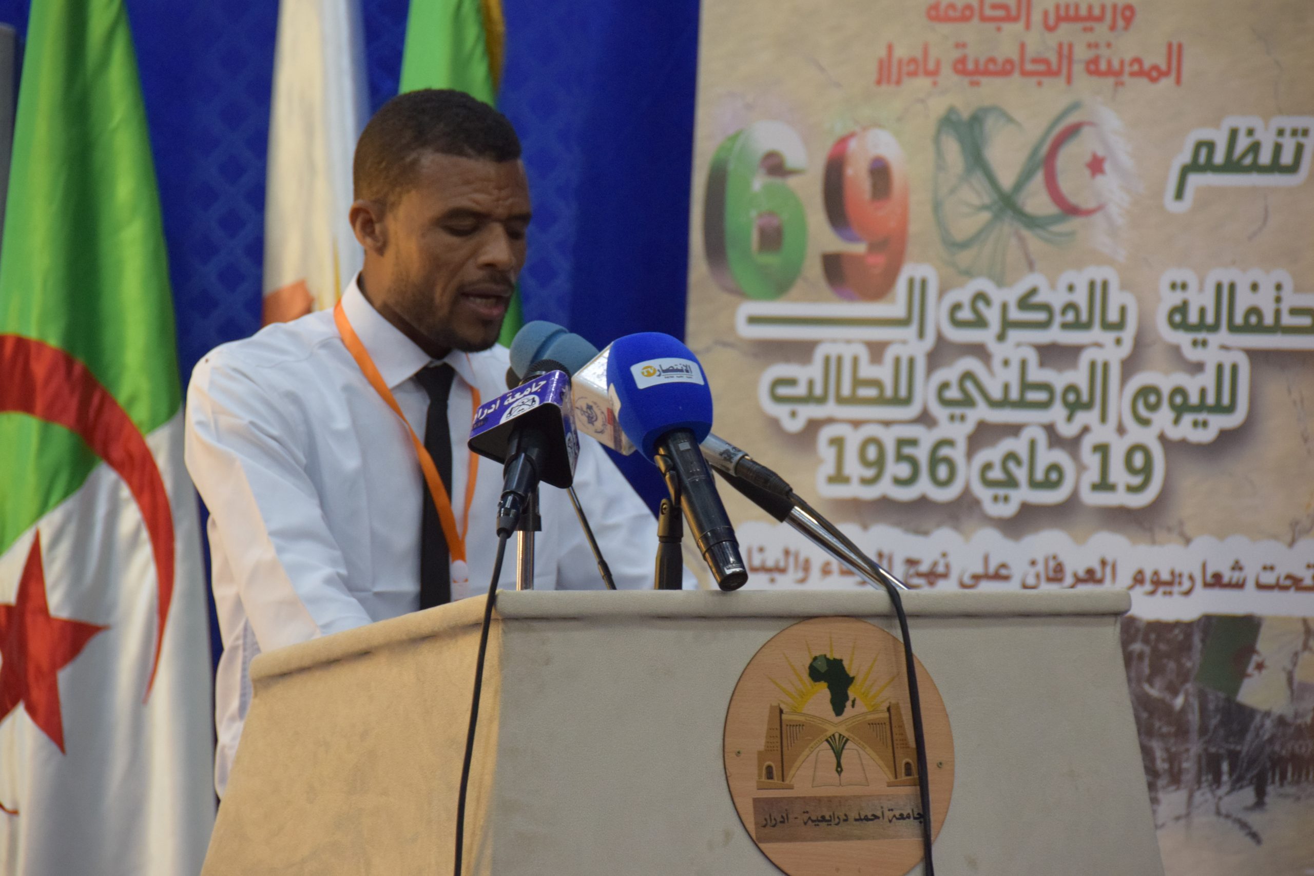 السيد شريد رشيد الأمين العام للولاية المكلف بتسيير شؤون ولاية أدرار ، أستذكر بدوره هذا اليوم البطولي ومحطاته التاريخية، منوها أن الاحتفاء بهذه الذكرى الخالدة تعبيرا عن وفائنا للذاكرة الجماعية التي صنعتها كل الأجيال ، وبرهانا عن تشبت الجزائريين بوطنهم ومدى حرصهم على وحدته وتماسكه وصونهم لكرامته وعزته، متطلعا بالمناسبة إلى بناء جامعة منفتحة على اقليمها الإقليمي والدولي تستهدف النوعية والجودة وترعى الابداع والامتياز ،مهنئا الطلبة بعيدهم الوطني متمنيا لهم النجاح والتوفيق.